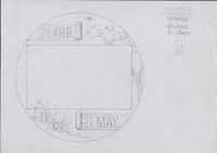 Tauro Boceto a lápiz del reverso de la medalla que representa al signo Tauro, con las fechas que corresponden a este signo zodiacal y con anotaciones del autor. Las flores y árboles decorativas están en relación directa con el mes de mayo.
