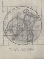 Toreo de capa Boceto a lápiz, con fondo cuadriculado para una posible transposición a otro material y tamaño, de la imagen elegante de un torero haciendo un pase de capa, con apuntes a lápiz del título.