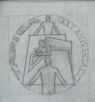 Tafisa Boceto a lápiz de una de las caras de la medalla conmemorativa del veinticinco aniversario de Tafisa, representado con la imagen de dos hombres en los extremos de un tablero de trabajo donde otro señor dibuja y proyecta ayudado por una escuadra.