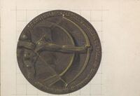 Tiro al arco Reverso de una medalla sobre fondo cuadriculado a lápiz, con la imagen de la cabeza ladeada de un hombre sobre el brazo con el cual tensa la cuerda mientras que con el otro lo mantiene completamente estirado para lanzar la flecha.