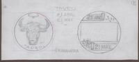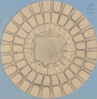 Tauro Boceto a lápiz de una medalla con la cara de un cabrito de un toro de frente símbolo del signo del zodiaco representado, junto al boceto de la medalla anotaciones también a lápiz del autor.