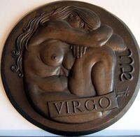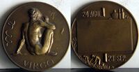 Virgo Fotografía de la cara de una medalla donde se aprecia el bajorrelieve con la imagen de una mujer desnuda con la cabeza apoyada en sus brazos cruzados sobre una de sus rodillas levantada, en uno de sus muslos la cartela correspondiente al signo del zodiaco que representa.OTROS ARCHIVOS: Mbo/313