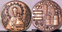 Valencia, medalla religiosa Fotografía de una medalla representativa de Valencia, donde en el anverso se aprecia la imagen de La Virgen de los Desamparados y el reverso varios elementos arquitectónicos representativos de la región junto a decoraciones frutales.Para Acuñaciones Españolas. Otros Archivos.: MBO/ 498-499