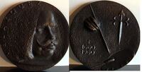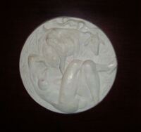 Una mujer y una cabra En esta medalla de color blanco se ha representado en su espacio a una mujer tumbada y desnuda en la parte inferior mientras que en la parte superior se encuentra una cabra en pie. Las figuras están en alto relieve.