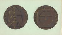 XXV Aniversario Tafisa Dibujo de las dos caras de una medalla conmemorativa en el aniversario de Tafisa, en el anverso la imagen central de una gran mesa de trabajo donde un hombre dibuja ayudado por una escuadra y ambos lados dos hombres sujetando el tablero, a su lado el reverso donde se representa la letra T inscrita en una circunferencia sobre un cuadrado.Sin referencias no llegó a realizarse?