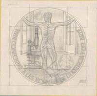 Vivir conforme a la normas de la ciencia del arte Boceto a lápiz sobre fondo cuadriculado de la cara de una medalla, con la imagen de un hombre de espaldas apoyándose en las contrapuertas de una ventana con los brazos en cruz y el cuerpo dejando ver la anatomía interna, junto a un microscopio y demás elementos de estudio.Proyecto de una medalla, Sin referenmcias.