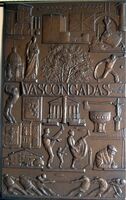 Vascongadas Fotografía de una placa de bronce representativa de Las Vascongadas, con las figuras y elementos iconográficos significativos de la región, entre el que destaca la bandera de Euskadi.Otros Archivos: Mbo/328 MEN/1325
