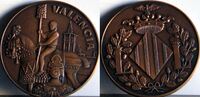 Valencia Fotografía de las caras de una medalla conmemorativas de Valencia, en el reverso se aprecia a una fallera de espaldas frente a un hombre vestido con el traje típico valenciano sobre un caballo engalanado, junto al reverso donde se representa el escudo de valencia franqueado por dos L y contorneado por una corona de laurel.