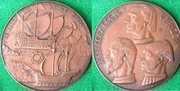 Y se abrirá una gran tierra. J. de la Cosa. C. Colón. V.Y. Pinzón En la primera medalla se ven algunos barcos mientras que en la segunda destacan tres bustos de perfil de tres hombres. Tanto las inscripciones como las figuras están realizadas en alto relieve.