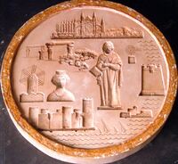 Baleares Molde de escayola del negativo de una medalla de la Comunidad Balear representado por la Catedral de Mallorca, la figura central de Ramón Lull junto a unos menires Megalíticos y el castillo de Belver.
