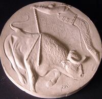 Banderillas Molde de escayola del positivo de una medalla que representa la escena taurina del salto de un banderillero que pone el segundo par de banderillas en el lomo del toro de un toro que le busca con su mirada.