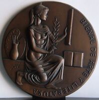 Bienal de Arte y Literatura Fotografía de las caras de una medalla representativa de La Bienal de Arte y Literatura con la imagen de una mujer de perfil con un vestido semitransparente que marca la figura desnuda de su cuerpo sujetando una rama en sus manos junto a una paleta de pintor y un jarrón con pinceles, en el reverso se aprecia una placa metálica que ocupa todo el campo de la medalla junto a la leyenda correspondiente.Realizada para la Casa de la Moneda. Otros archivos: MG/1547