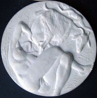 Bebiendo leche Molde de escayola de la cara de una medalla donde se aprecia la figura de una mujer desnuda tumbada y bebiendo leche directamente (dando una sensación salvaje) de la ubre de la vaca.