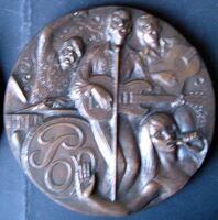 Bienal de Arte y Literatura Fotografía de un bajorrelieve de una medalla donde se representa la figura de una mujer con un vestido cuyos pliegues dejan entrever su cuerpo desnudo, que sujeta en una de sus manos una rama junto a un libro abierto, una paleta de pintor y un jarrón con pinceles.Otros archivos: Mbo/ 346 Mbr/1477