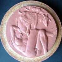 Bebiendo leche Molde de escayola de la cara de una medalla donde reaprecia la figura desnuda de una mujer tumbada bebiendo leche directamente de la ubre de la vaca.