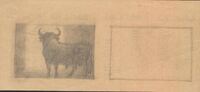 Boceto de toro de espaldas Boceto publicitario con dos encuadres: en uno de ellos, un toro frente a un rectángulo claro que bien podría simbolizar la salida de chiqueros; el otro rectángulo está vacío, posiblemente en espera de la leyenda publicitaria.