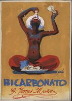 Bicarbonato. G. Torres Muñoz En este dibujo firmado por el pintor en letras azules y sobre un fondo amarillo mostaza se ha representado en el centro de la composición a un hombre hindú con turbante blanco y calzas rojas sentado con las piernas cruzadas y bebiendo algo. Bajo su figura se encuentra el lema del dibujo, “bicarbonato”, en color azul y la firma de un nombre en color rojo, “G. Torres Muñoz”.