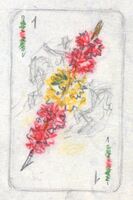 As de banderilla Carta perteneciente a la baraja española, corresponde al as, el palo de la carta es lo que varía siendo una banderilla, debajo de la imagen a color se aprecia el dibujo a lápiz de una figura a caballo.