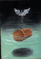 Arte Imagen de un corcho de botella, flotando sobre el agua,con un leyenda donde se lee “Arte”, sobre el corcho un alfiler con unas alas indicando que ellas son las responsables del fenómeno por el cual el corcho flota sobre el agua, la ligereza.