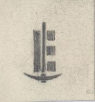 Boceto de pico y letras “E” y “T” Al igual que en su primer boceto, se observa un dibujo de la letra E que ocupa el centro del espacio, y la “T” en rojo entrelazada con ella. El pico de trabajo superpuesto, paralelamente a las letras.