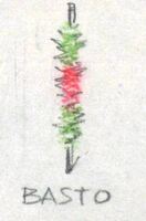 Basto Sobre un fondo blanco se ha representado en el centro la imagen de una banderilla en posición vertical de color verde y rosa. En la parte inferior se puede leer “basto”.
