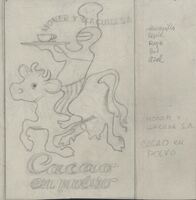 Boceto de imagen publicitaria de cacao en polvo Boceto a lápiz, de la imagen publicitaria de cacao en polvo, el dibujo está divido en dos espacios, el primero con la imagen de una figura sin definir con pantalón a rayas sobre una vaca portando en sus manos una taza de cacao de donde sale el nombre de la empresa, en el segundo espacio el nombre de la marca y de la empresa anunciante con notas sobre los colores a utilizar en el spot publicitario.