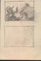 Boceto de toros Boceto en dos espacios encuadrados, el inferior se encuentra vacío (posiblemente es espera de un eslogan publicitario) y en el superior, apuntes de astas de toros que apuntan en dirección a la colina donde se perfila la famosa silueta del Toro.