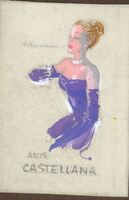 Boceto de anís Castellana Sobre un fondo claro, la imagen de una mujer vestida elegantemente con vestido de noche y guantes, sujetando una copa de anís, con los rótulos a lápiz negro. De sus labios sale un “buenísimo”.