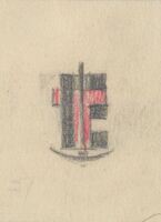 Boceto de pico y letra Dibujo de la letra E que ocupa el centro del espacio, y un pico de trabajo superpuesto paralelamente a la letra, lo que hace una composición de constructivismo muy sugerente.