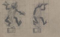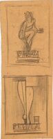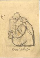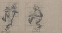 Radio y lámpara de Aladín 2 Dibujo compuesto por dos bocetos sobre fondo cuadriculado, con dos imágenes de una radio conectada a una lámpara de donde sale la figura de un genio con forma de un mono caracterizado con una gran barba y turbante llevando en sus manos una bandeja.