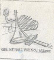 Para materias plásticas. Azanon Sobre un fondo blanco grisáceo y bajo el lema “para materias plásticas” se distinguen un martillo y más objetos pero de difícil definición por ser apenas bocetos. La frase del lema se encuentra en la parte inferior.