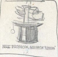 Para productos químicos En el centro de esta composición en la que destaca el color blanco grisáceo se ve un sombrero boca abajo en cuyo interior hay algo de difícil definición. Líneas abocetadas intentan enmarcar el dibujo.