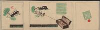 Su accidente no tendrá consecuencias Un tríptico de un boceto para un cartel con la leyenda de “su accidente no tendrá consecuencias”, la primera escena es la imagen de un coche que se estrella contra un árbol, a continuación en primer término dos figuras, una mujer tumbada y un hombre a su lado socorriéndola, detrás de ellos el árbol truncado por el golpe del coche y delante de las figuras un objeto rectangular con tapa y compartimentos, por último una tercera escena unas rayas verdes paralelas en posición oblicua con un punto rojo debajo de ellas.
