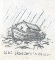 Para seguros occidente 2 Sobre las aguas grises del mar y en medio de una tempestad de lluvia se ha dibujado un barco con una casa encima. Predomina el blanco y el gris.