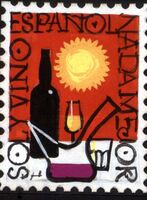 Sol y vino Español, nada mejor Cartel, que imita a un sello, compuesto por un bodegón con objetos relacionados con el vino: en primer término un porrón transparente medio lleno, detrás un vaso y una copa, y por último, una botella de vino sobre un fondo rojo. El gran sol hispánico lo ilumina todo.