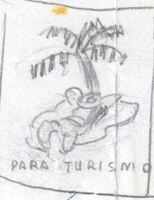 Para turismo En la composición donde destaca el color blanco grisáceo se ha dibujado en el centro la silueta de una isla con palmeras en la que se encuentra un hombre tumbado. Líneas abocetadas intentan enmarcar el dibujo.