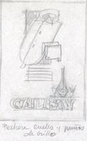 Pechera, cuello y puchos de brillo Se ven en esta composición, en la parte superior, líneas horizontales y el cuerpo de una camisa. La palabra “calasay” está presente en la parte inferior, en donde una línea separa el dibujo del lema. Destaca el color blanco grisáceo.