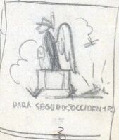 Para seguros occidente “Para seguros occidente” se ha representado de perfil y en el centro a un hombre con traje oscuro, sombrero y alado llevando un maletín blanco. A su alrededor líneas ondulantes crean las nubes que rodean a la figura. Líneas abocetadas intentan enmarcar la composición.