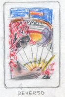 Reverso En esta carta con el lema de “reverso” en la parte inferior se ha representado en forma de boceto una imagen enmarcada en la que se ve una mujer con un abanico observando desde su lugar la plaza de toros.