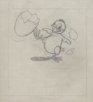 Poyuelo saliendo del cascarón Dibujo a lápiz de la imagen de un poyuelo feliz que ha salido del cascarón que aparece roto a su lado, y al que parece que está dando una estupenda patada. Toda la escena está enmarcada.