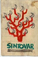 Sintovar Con el nombre de “sintovar” en verde se ha representado sobre un fondo cuadriculado la imagen de un árbol rojo en cuyas ramas cuelgan pequeñas lunas blancas con su silueta negra.