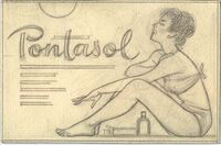Pontasol Bajo el lema de “pontasol” subrayado con varias líneas horizontales se ha dibujado, en primer término, a una mujer con pelo corto, sentada y de perfil con un traje de baño. Debajo de sus piernas que arquea hacia arriba se ven frascos de cremas. En el dibujo predominan los colores grises sobre un fondo amarillento.