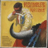 Pasodobles toreros En este dibujo enmarcado, con el título en la esquina superior izquierda de “pasodobles toreros” en letras rojas, se ha representado la imagen de un torero con la espada preparada para clavársela al toro del que solamente se ve su cabeza y cornamenta como dos banderillas azules. El fondo del dibujo es amarillo y está presente el boceto de la firma del pintor en la esquina inferior de la izquierda. A la derecha, inferior y superior, hay algunas inscripciones en color gris.