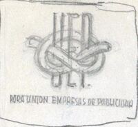 Para unión de empresas de publicidad Se destaca en el centro de la composición, donde se ve el lema en la parte inferior, un nudo hecho a base de cuerdas. Líneas abocetadas a modo de enmarque rodean la figura. Destacan los colores blanco grisáceos.