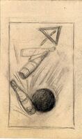 Partida de bolos En este dibujo enmarcado donde destacan las líneas oscuras se desarrolla una partida de bolos. Una pelota es lanzada contra los bolos que por el efecto del impacto saltan por los aires. Una figura triangular se ve en segundo plano.