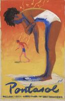 Pontasol Bajo el título en letras azules de “pontasol” y en un fondo amarillo y rojo destacan en el dibujo dos figuras: en primer término, encima de una toalla blanca, una chica con traje de baño blanco se agacha mientras los rayos de sol le inciden en la espalda; en segundo término, un chico con traje de baño azul sobre el que también le inciden los rayos del sol. Sobre el título y a la izquierda se vislumbra el boceto de la firma del pintor.