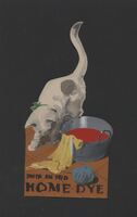 Tinte Home Dye Cartel publicitario del tinte rojo Home dye, donde aparece la figura de un gato junto a un barreño metálico que contiene tinte rojo y de donde sale una prenda amarilla y una madeja de lana que es con la que intenta jugar el gato.