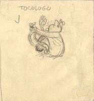 Tocologu En el centro de la composición y sobre fondo amarillo se representa a un hombre que coge sus piernas con sus manos, levantando una de ellas. Predominan las líneas oscuras.