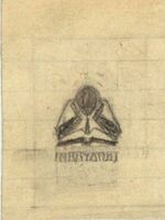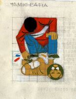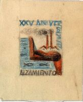 Un hombre mitad negro, mitad amarillo En este dibujo enmarcado, con el fondo rojo y firmado por su autor destaca la imagen de una figura humana bastante peculiar con el cuerpo mitad negro, mitad amarillo. En cada pie destaca una espuela amarilla y sobre su cabeza la silueta de un sombrero alado. Solamente tiene el brazo derecho, de color negro y con una mano amarilla que termina en forma de pez. Detrás de esta figura destaca, en el centro, un cuadrado de color blanco.