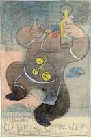 Un hombre extraño bebe un líquido amarillo En este dibujo se representa a una figura extraña de color marrón, corpulenta y saltando con tres soniquetes amarillos en su barriga y un delantal blanco transparente mientras que con una mano sujeta una botella de la que sale un líquido amarillo y con al otra mano se lleva algo a la boca y bebe.